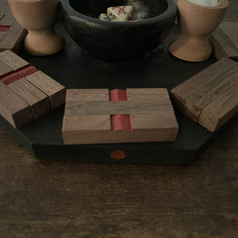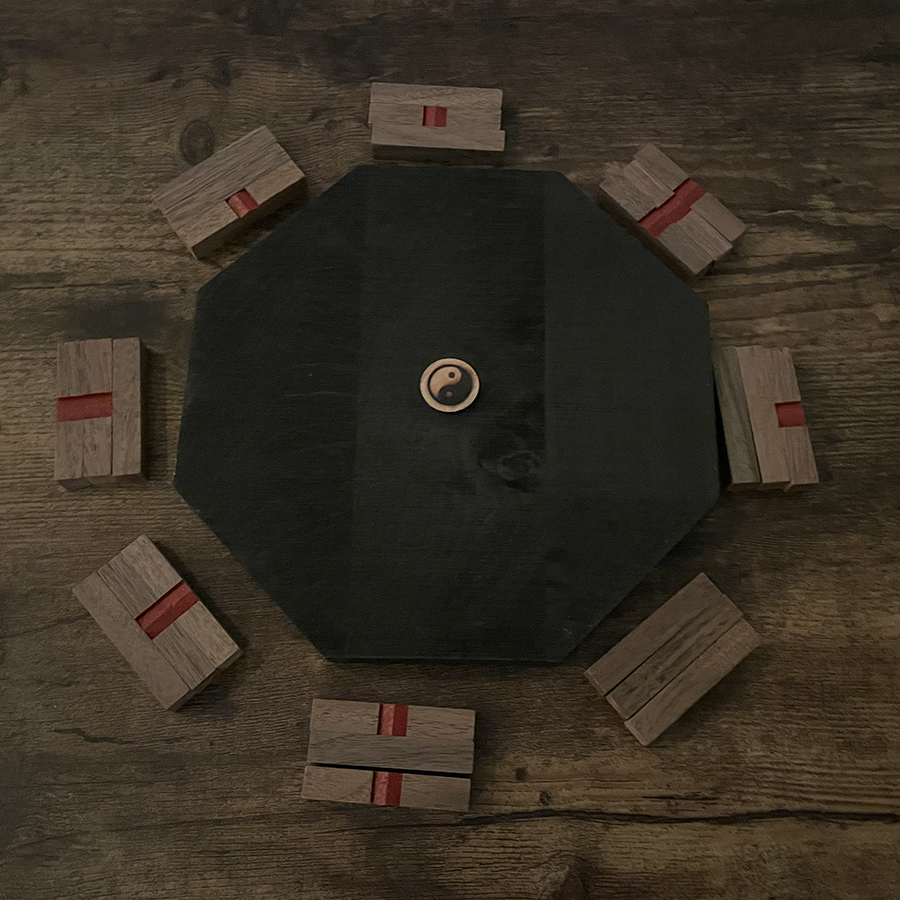 易サイコロ専用盤です。また、動画(https://youtu.be/piPlfn5qixg)で説明しています通り、八卦鏡を形どった八角トレイに、ミニ算木を計4セット分を活用して、先天図、後天図、日、月、年の方位盤を作ることが出来ます。占いたい事柄に応じて、方位盤の作成はアイデア次第、設定次第、自由です。オプションとして、清めの盛り塩もセット付けております。易サイコロ(従来品や当店商品の観象易サイコロ)の占盤としてミニ環境を提供し、より幅広い、格式高い占法にご活用ください。